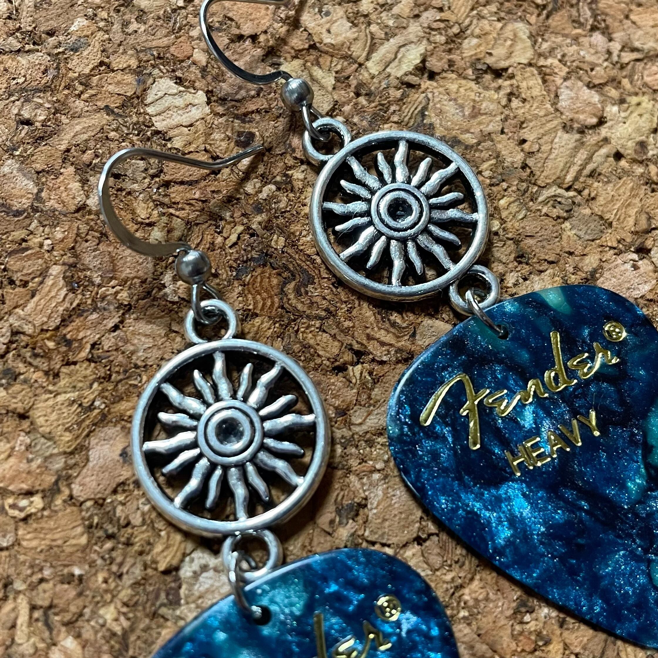 Fenderのピックと太陽モチーフのシルバーパーツを組み合わせたフックピアスです。