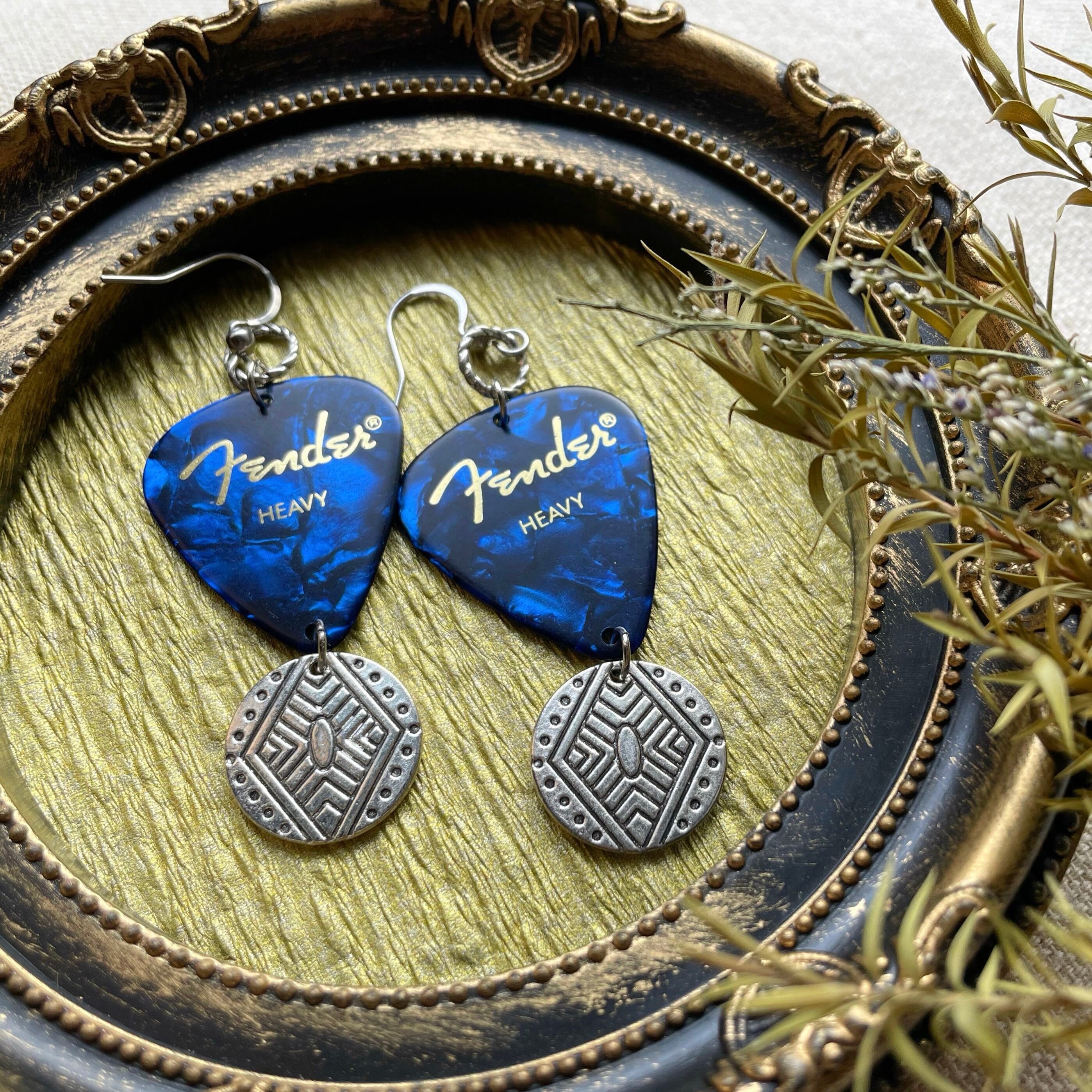 Fenderのピックと幾何学模様のシルバープレートパーツを組み合わせたフックピアスです。