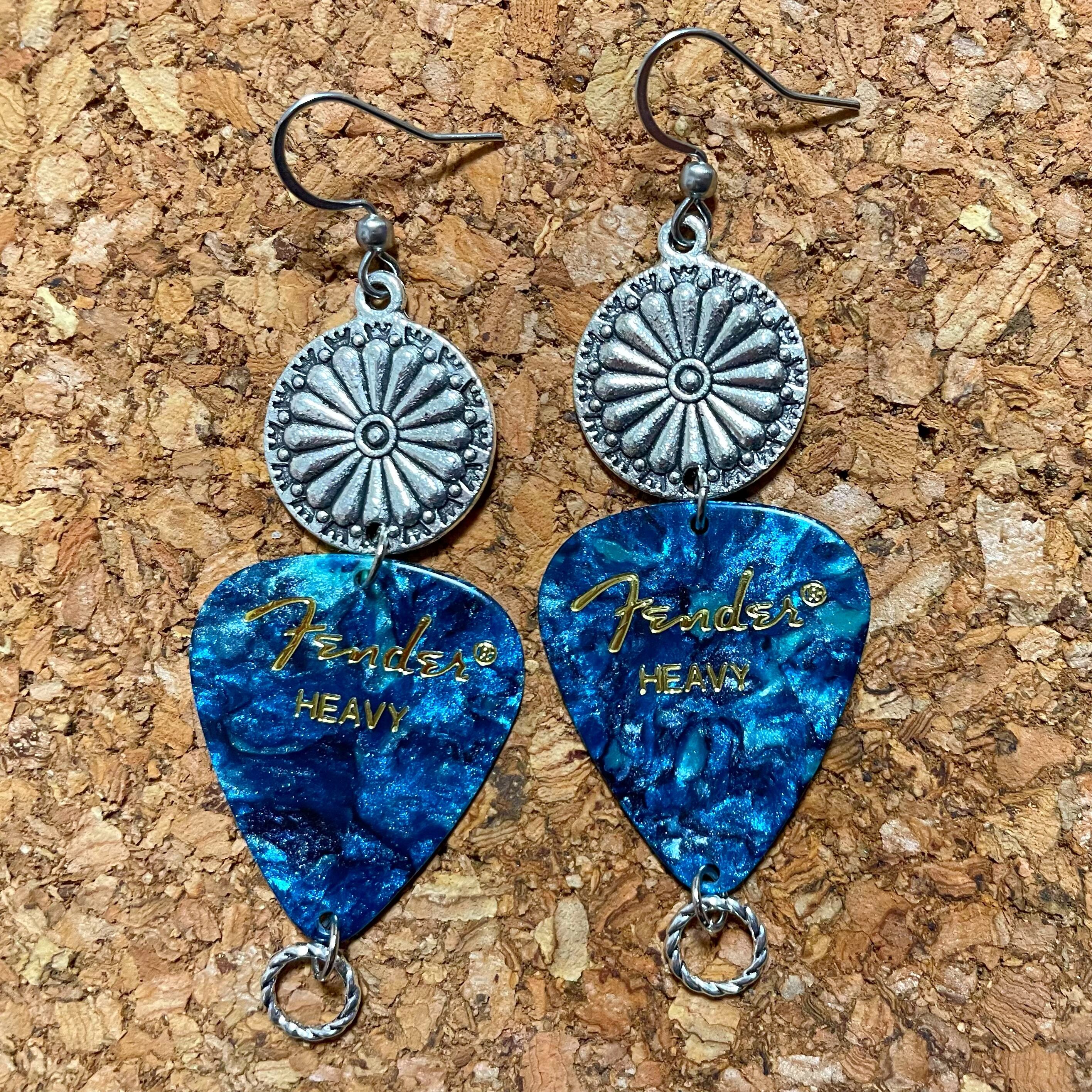 Fenderのピックとフラワーモチーフのシルバーパーツを組み合わせたフックピアスです。