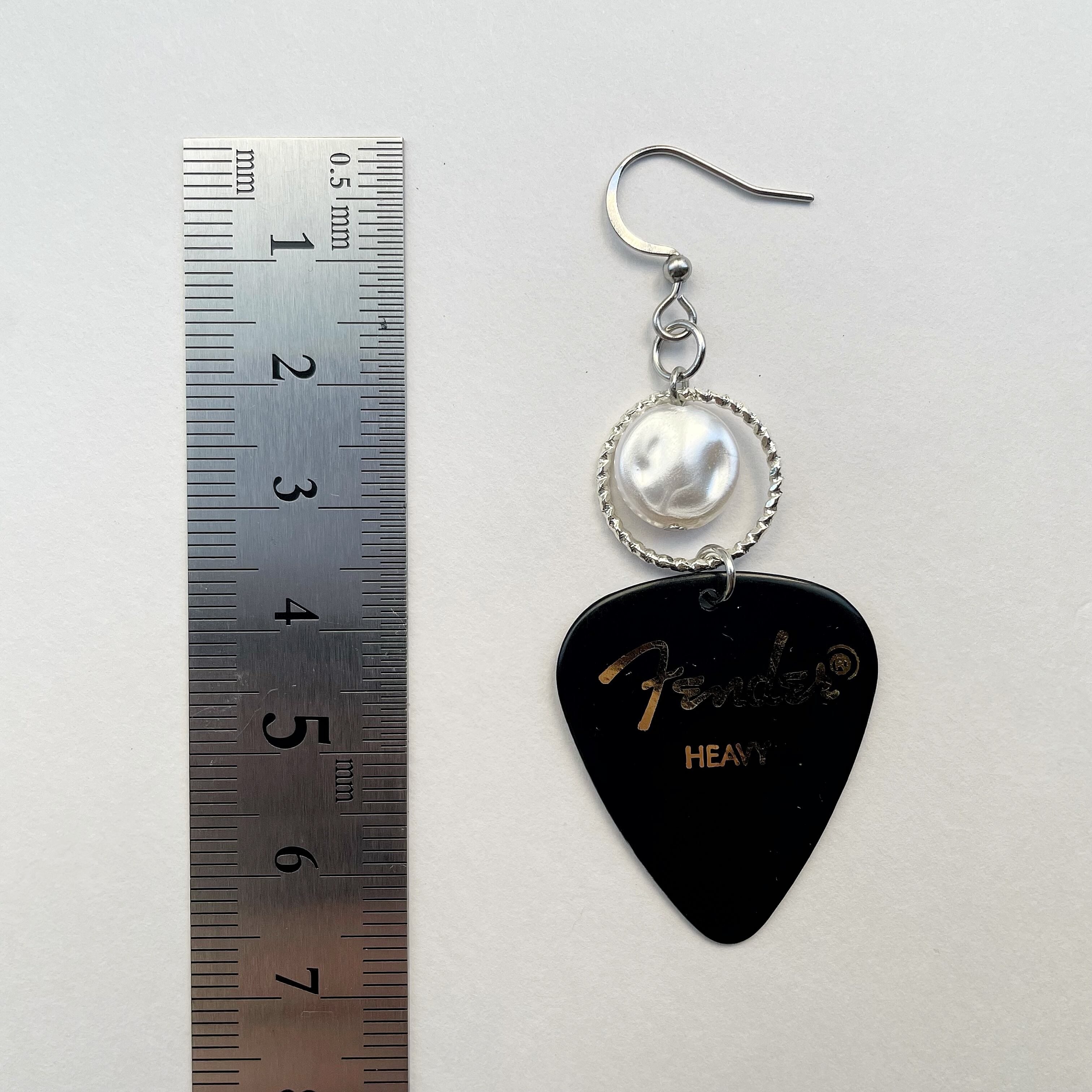 Fenderのピックとシルバーリング、パールカラーのビーズを組み合わせたフックピアスです。
