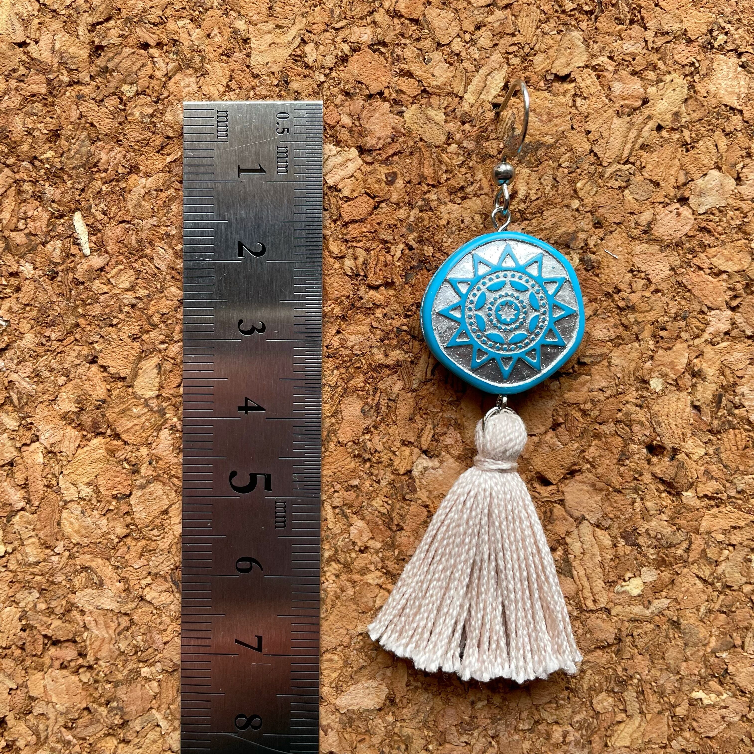 ブルーとシルバーの幾何学柄ビーズに優しいアイボリーカラーのタッセルを合わせ、シンプルで大人らしいデザインに仕上げました。
