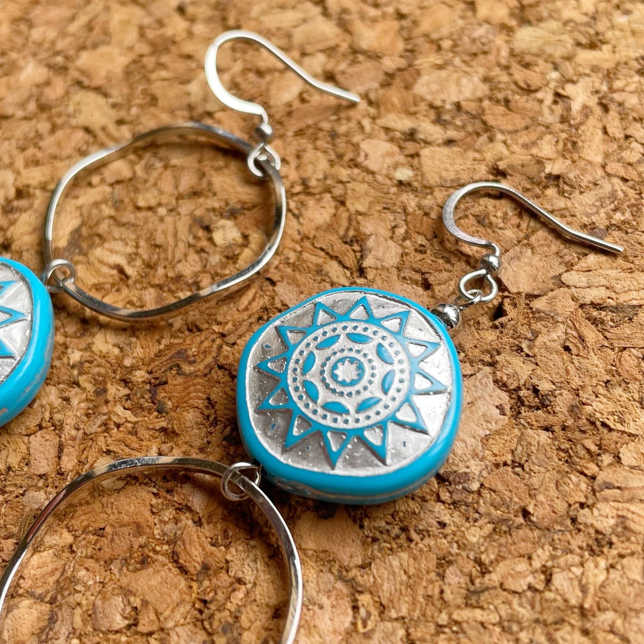幾何学柄ビーズはさわやかなブルーとシルバーのカラーリング。