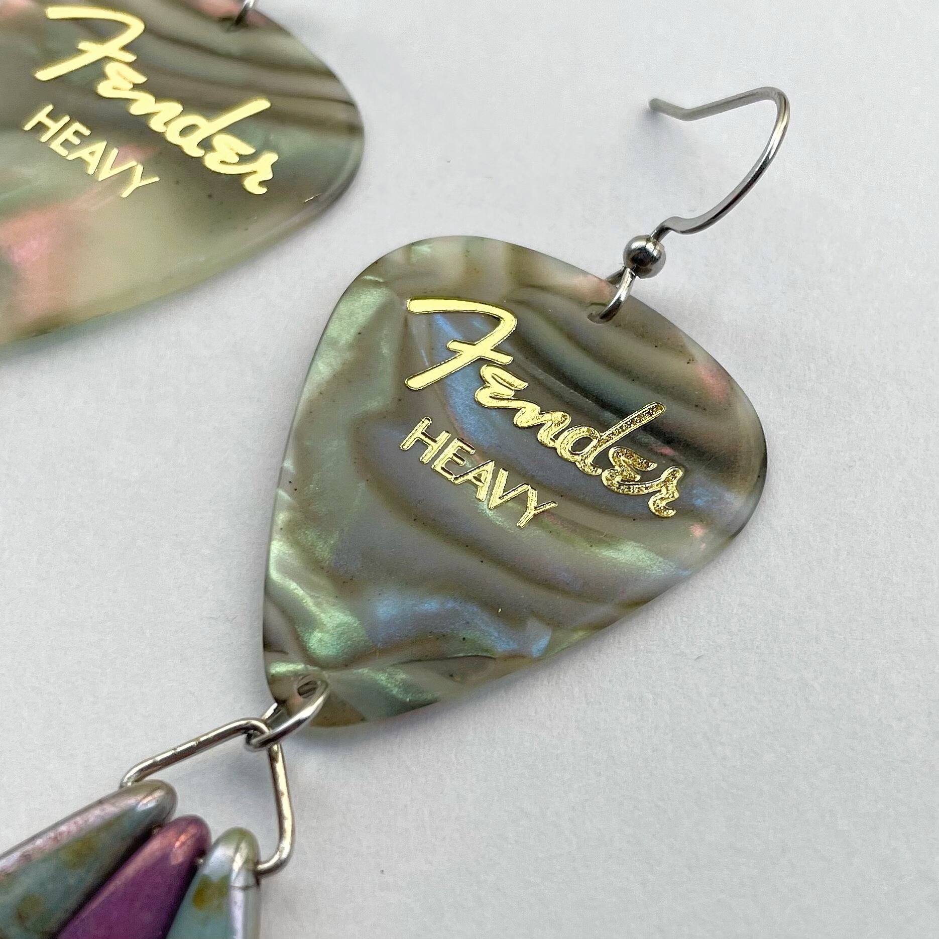 Fenderのピックを使ったフックピアスです。