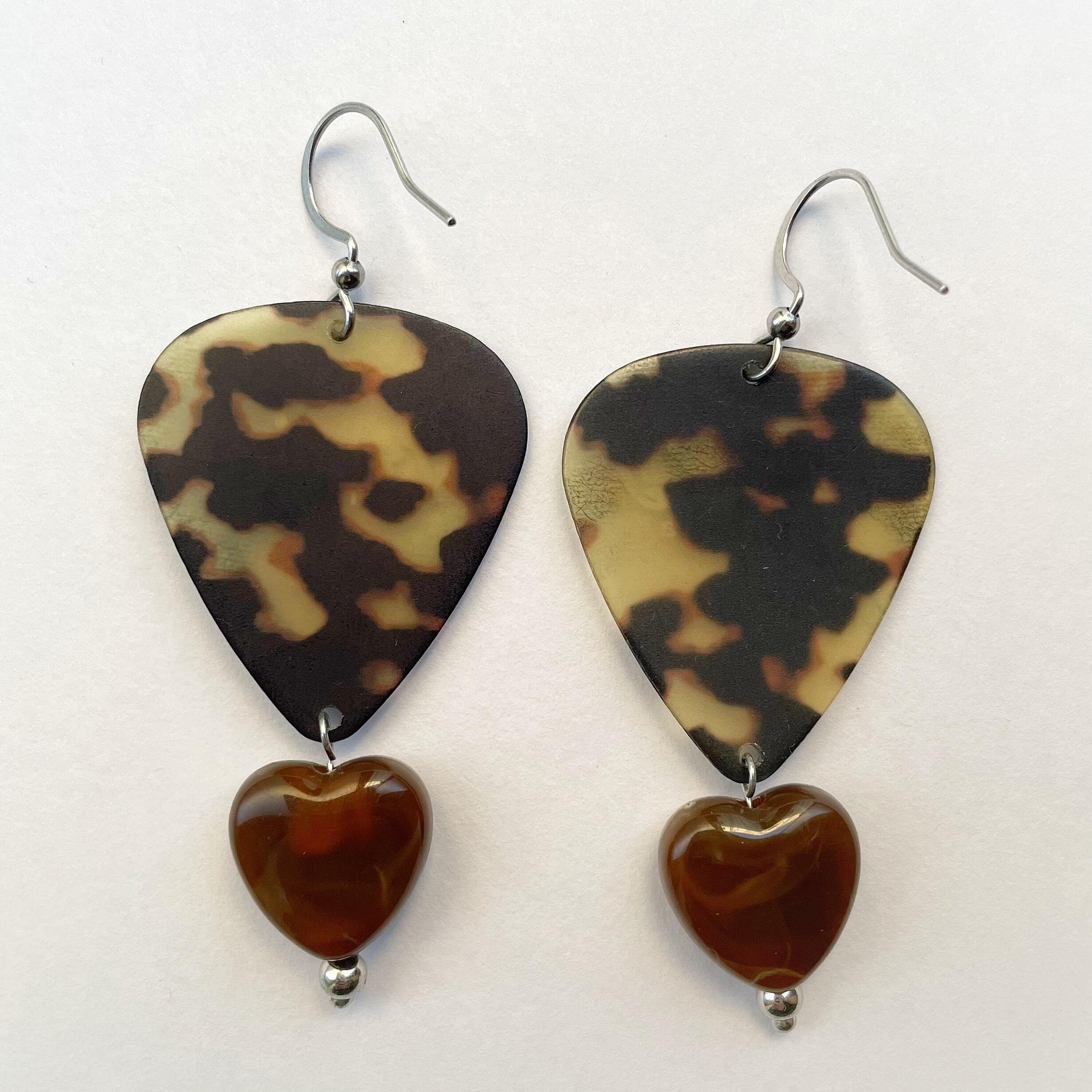豹柄のような柄のピックに、カフェオレカラーのハート型ビーズを合わせました。